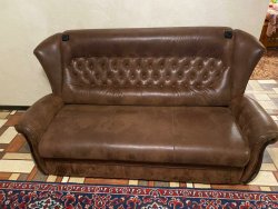 Заказчик попросил заново сделать каретную стяжку. До обращения к нам на диване распустились нитки, ослабла стяжка складок и отвалились пуговицы.