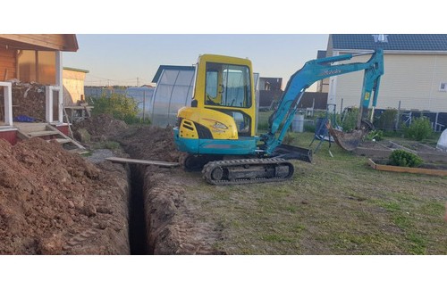 Мини-экскаватор Kubota — это надёжная и эффективная техника, которая справится с любыми задачами. Его компактные размеры позволяют работать в условиях ограниченного пространства, например, вплотную к забору. Глубина копания достигает 3 метров, а высота выгрузки — до 3,5 метров.