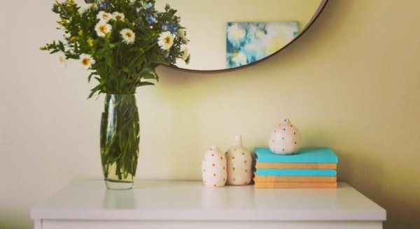 Желтый цвет, как и его вариации (солнечный, светло-желтый и лимонный), позитивно влияют на настроение, помогают раскрепоститься. Лучше всего эти цвета использовать в помещениях, где не хватает естественного освещения. С таким цветом стен идеально сочетаются белые и синие мебель и аксессуары.
