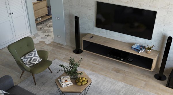 В кухне плитка сочетается с серой влагостойкой краской и напольной плиткой в форме гексагонов. Также заказчики хотели видеть в интерьере деревянные панели, и дизайнеры предложили оформить ими стену за телевизором. Выбрали панели в форме ромба, а само панно немного «утопили» в специально подготовленную нишу.