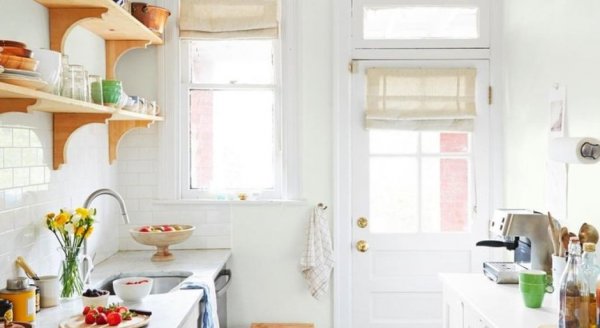 - Довольно важный момент — наличие естественного освещения. Чем больше его будет, тем просторнее и воздушнее будет смотреться ваша кухня, так что откажитесь от плотных штор в пользу лёгких полупрозрачных занавесок, жалюзи или римских штор.