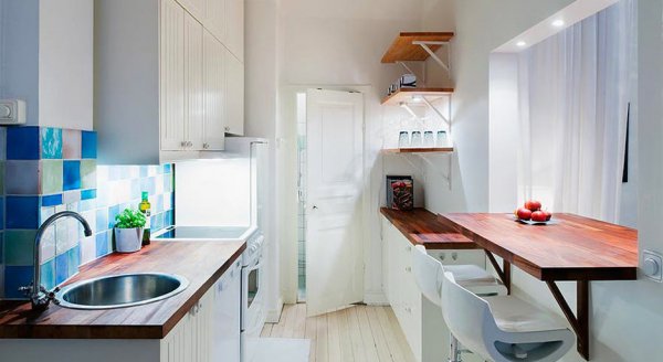 Конечно же, в небольших и тем более узких помещениях лучшим решением окажется белый цвет с разумным добавлением акцентных тонов, вроде голубого или салатового. А вот использование ярких и тёплых красок приведёт к чёткому обозначению границ и, как следствие, стеснению пространства. В то же время нельзя делать всю кухню лишь в белых оттенках, сильное размытие границ может привести к дезориентации.