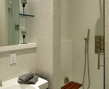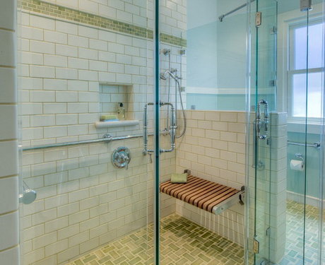 Если детям нужна ванна, то старшее поколение предпочтёт душ. В него просто зайти — слив можно устроить прямо на уровне пола, без поддона. Внутри кабинки можно установить скамеечку, на которую будет удобно присесть. Голова не закружится при смене положения из горизонтального в вертикальное, как в ванне. А если установить коврик, который не скользит, вероятность травм минимизируется.