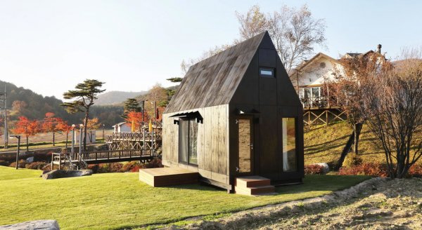 В 2018 году в городе Gangwon специально к Зимним Олимпийским играм 2018 года построили необычный комплекс коттеджей. Малогабаритные дома соорудили из деревянных щитов. Покрыть их био- и огнезащитными препаратами было невозможно, так как район, где велась застройка, защищают от любых экологически вредных воздействий. Поэтому снаружи фасады обожгли газовой горелкой, сделав их таким образом устойчивыми к ультрафиолету, воде и огню. Внутри почти все поверхности отделаны необработанной фанерой. Грамотный подход к планировке помог с выгодой обыграть скромную площадь. Здесь нашлось место для гостиной, кухни и санузла, на антресольном уровне оборудовали спальню. Несмотря на то, что постройка очень компактна, в ней нет ощущения тесноты или неудобства.