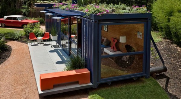 Оговоримся сразу, что перед авторами проекта стояла задача разработать гостевой дом с ванной комнатой и спальней. Грузовой контейнер не претерпел значительных изменений. Он находится в американском штате Техас, для которого характерен вполне благоприятный климат, - так что в утеплении не нуждался. Кровлю решили сделать эксплуатируемой и высадили на ней растения - спустя некоторое время они разрослись пышным зеленым ковром. Для полива обустроили автоматическую систему с использованием технической воды. На одном из фасадов зафиксировали сетку, служащую опорой для дикого винограда. Позднее он разрастется и превратится в красивый зеленый экран, защищающий стенку от перегрева. В жилом пространстве организовали гостиную с диваном и мини-санузел с душем. В виду того, что дом задумывался как гостевой, кухня не предусматривалась с самого начала проектирования. От жары обитателей спасает система кондиционирования.
