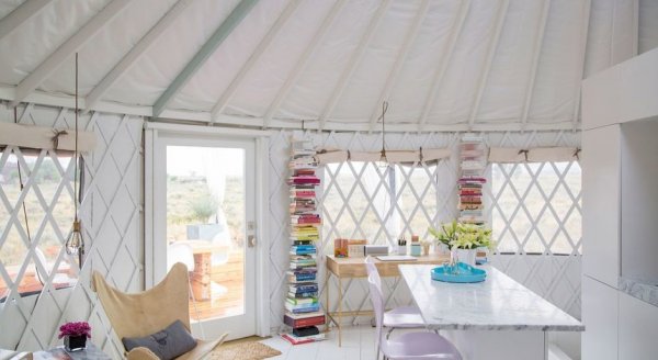 Автор этого проекта много путешествует и предпочитает активный образ жизни. Так в одной из поездок ей пришла идея спроектировать дом, похожий на юрту. Получившаяся конструкция практически не отличается от жилищ монгольских и тюркских кочевников. В основе - складной каркас из дерева, обтянутый прочной, непродуваемой мембраной. Но если в традиционной юрте есть лишь дверной проем и отверстие в центре купола для вентиляции и освещения, то эту постройку отличают большие окна. Чтобы в домике и в холодную погоду было уютно, установили дровяной камин.