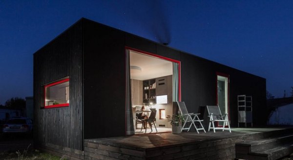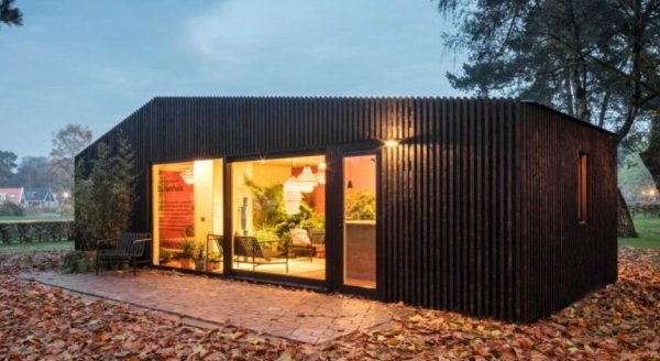 Коттедж Buitenhuis собрали на производстве всего за пару дней. Деревянный каркас утеплили и снаружи защитили гидроизоляционными пленками. Фасады отделали черными деревянными рейками. Для кровли же выбрали бюджетный профнастил. Внутри дом обшит панелями из многослойной березовой фанеры. Обстановка Buitenhuis способна приятно удивить. Маленькая площадь поделена на кухню-гостиную, спальню и санузел с душем. А под самой крышей есть два дополнительных спальных места - как раз на тот случай, если гости захотят остаться с ночевкой.