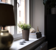 Как и полагается в интерьерах скандинавских квартир, декор присутствует в умеренных дозах. Здесь он представлен в виде графики на стенах, цветочных горшков с зеленью, плетеных корзин, книг и милых аксессуаров на подоконниках. Акцент сделали на текстиле. В этом интерьере он выраженно фактурный, очень эклектичный и тяжелый – взять хотя бы бархатные подушки и кресло, обитое тканью с дамаском.