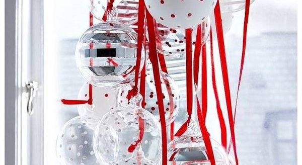 Если вы не собираетесь наряжать ёлку в этом году, используйте игрушки в качестве декора на окне. С их помощью легко создавать красочные композиции. Не обязательно они должны быть одинакового размера и одного цвета. Сочетайте маленькие шарики с большими.