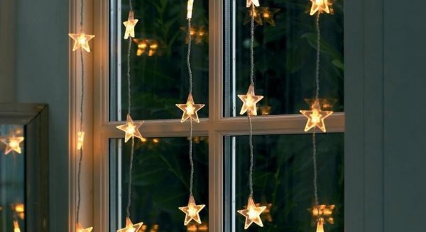 Световые инсталляции создадут на вашем окошке волшебную атмосферу. Гирлянды из звёзд, развешанные вертикально, напоминают звездопад.