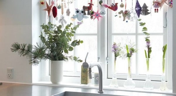 Если у вас есть интересные растения в горшочках, применяйте их для создания общей праздничной композиции. Достаточно пары игрушек и одной веточки, чтобы окно на кухне стало более привлекательным. Или же протяните посередине окна одну верёвочку и вешайте на неё любые игрушки, шишки, звёздочки. На подоконнике поставьте вазу с зелёными веточками.Мишура, дождик, конфеты, ёлочные игрушки, бусины — всё используйте для украшения окна. Радостное настроение будет вам обеспечено.