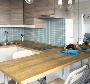 Решением стала П-образная планировка с барной стойкой, где нашлось место для всего необходимого. А визуально расширить пространство помогли зеркала.