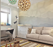 Такой же «елочкой» выложен и фартук на кухне. В отделке архитекторы использовали декоративный кирпич, МДФ и керамогранит. Цветовое решение построено на контрасте светлых и темных оттенков серого цвета, только в детской на стенах появляется авторская роспись. В гостиной монохром разбивает абстрактный триптих на стене над диваном.