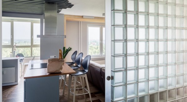 От коридора кухню-гостиную отделяет стена из стеклоблоков – эффектное решение, которое также позволяет сделать прихожую намного светлее.