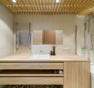 Для отделки главного санузла подобрали плитку песочного цвета. Фасадную стену выделили объемной плиткой. Потолочные конструкции сделали из дерева, а стены окрасили в светло-серый цвет.