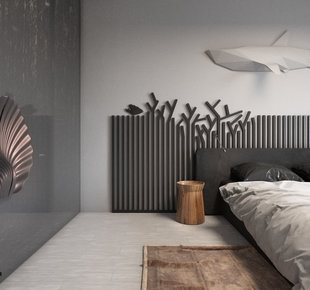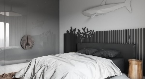 При минимуме декоративных элементов и аксессуаров необычно и ярко выглядит панно из реек за изголовьем кровати в спальне. Оно имитирует коралловый риф с маленькой пугливой рыбкой, над которой безжалостно завис гипсовый барельеф акулы. Ручки в ванную комнату выполнены из металла в виде ракушки, акцентная деталь в продолжение морской тематики спальной комнаты. Перегородка сделана из стекла с переменной прозрачностью, что позволяет в одно нажатие превратить прозрачную стену в белую, матовую.