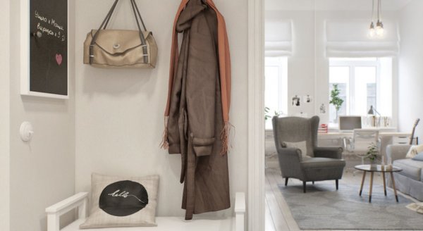 Пусть что-нибудь бросается в глаза. Даже большой букет цветов: много места он не займёт, и даже визуально разгрузит пространство.Не забудьте и об удобстве. Даже если в прихожей места хватает всего-то только на одну вешалку, вы наверняка найдёте ещё немного на подвесную полочку, которая может иметь ящик для ключей и на которую можно поставить что-то из косметики и даже повесить маленькое зеркальце. Не помещается пуфик, а сидеть на чём-то нужно? Проблему решит откидное сиденье, как в вагоне поезда (вот уж где узкие коридоры). Выход есть из любого положения.