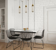 Живя в «доме-лауреате» и «доме-легенде», сложно не оглядываться на его историю. Поэтому владельцы квартиры очень хотели сохранить атмосферу «сталинки», но при этом подчеркнуть свою современность. В итоге интерьер получился на редкость эклектичным. За классику отвечают белые стены (а в спальне еще и с раскладкой молдингом), лепнина и паркет-елочка. Из лофта пришла кирпичная стена за диваном в гостиной. Скандинавский стиль представлен люстрами, журнальным столиком, стульями, диваном и декоративными подушками на нем.
