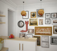 Поскольку хозяевам было важно продемонстрировать свою любовь к современному искусству, недостатка в соответствующем декоре нет. Всю стену за барной стойкой в гостиной украсила композиция из настенного декора, где присутствуют картины, постеры и фотографии владельцев квартиры в разных по стилевой принадлежности багетах. А запоминающейся фишкой интерьера стала декоративная конструкция на стене за диваном в гостиной. На белоснежной кирпичной стене дизайнер установила десятки лампочек Эдисона.