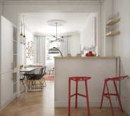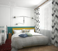 Сделать масштабную переделку в этой знаменитой «сталинке» архитектора И. В. Жолтовского на Ленинском проспекте владельцев заставили обстоятельства. В скором будущем они ожидают пополнения в семействе, но места для детской найти не смогли. Дизайнер Наталья Патрушева подошла к вопросу радикально: снесла часть стен, возвела новые, перенесла дверные проемы и «мокрую зону», совместила гостиную с кухней. Это позволило освободить целую комнату, где появилась яркая детская.