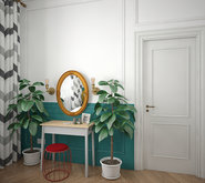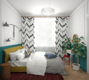 Как и полагается, самой яркой комнатой после переделки оказалась детская. Чего стоит один терракотовый шкаф во всю стену и оливковый письменный стол! Кровать и полочки, напоминающие скворечники, тоже предпочли необычные – их сделали на заказ специально для этого проекта. Кровать для спальни, наоборот, покупать не стали. Старую хозяйскую выкрасили в горчичный цвет, придав совершенно иной вид. Теперь она более органично смотрится на фоне зелено-бирюзового цвета стен.