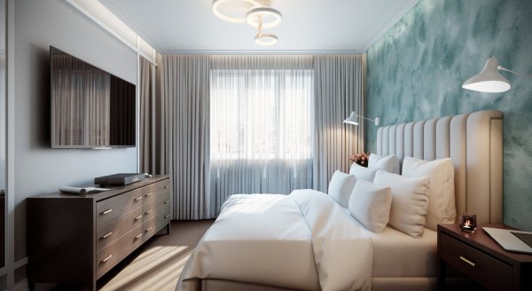 Отдельная спальня – еще одно принципиальное требование хозяина квартиры. Для ее оформления дизайнеры выбрали классический стиль и те же оттенки серой краски, что и в кухне-гостиной. Но здесь вместо оливковых акцентов появляется стена за изголовьем кровати с декоративной штукатуркой холодного зеленого оттенка. Напротив нее закрепили плинтуса прямоугольного сечения, раскладка которых придает восточный оттенок этому классическому интерьеру.