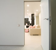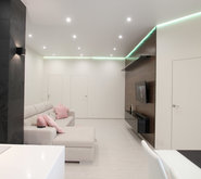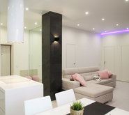 Все хранение сосредоточено в двух гардеробных. Первая – при входе, вторая – располагается за диваном в гостиной. Это единственное место, куда удалось вписать хозяйственное помещение 2,5×2,5 метра. В оформлении квартиры дизайнеры сделали ставку на теплые оттенки белого цвета. «В спальне – сероватый, в основной зоне основной тон ближе к бежевому. Практически во всех проектах мы используем не чистые цвета, а смешанные с серым: так удается избавиться от желтизны», – говорят авторы проекта.