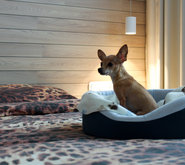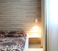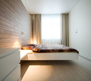 Дизайнеры создали совсем не скучный интерьер: придумали кухонный фартук из сланца, деревянную стену в изголовье и «парящую в воздухе» кровать