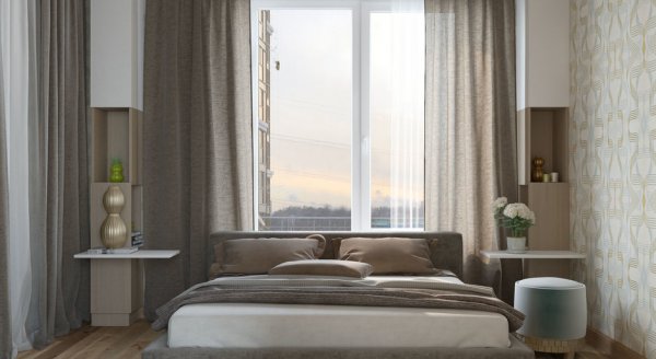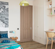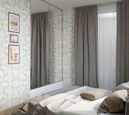 «В своих проектах я часто использую встроенные шкафы для организации хранения: так было и на этот раз, – рассказывает Ирина Кривцова. – В прихожей мы установили большой зеркальный шкаф для верхней одежды, также лавку с ящиками для обуви. В спальне родителей – встроенный шкаф, тоже зеркальный, а также стеллажи по обеим сторонам от кровати. Эти стеллажи выполнены из МДФ двух цветов (белый лак и шпон дерева), имеют полочки для книг и мелочей и прикроватный столик».