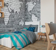 Для отделки стен выбрали краску: она проста в уходе. В спальне родителей использовали обои с геометрическим рисунком: при минимуме мебели и декора они как раз создают «обволакивающее» пространство. В гостиной стену за диваном покрыли декоративной штукатуркой с эффектом каменной поверхности. Привлекает внимание яркая плитка с геометрическими цветными орнаментами на кухонном фартуке. В прихожей дизайнер предложила сочетать кирпич и грифельную краску для записок – получилось здорово.
