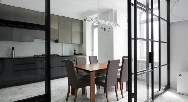 По отношению к пространству американцы – рационалисты, планировка должна быть функциональной, мебель – удобной.Поэтому в «сталинке» первым делом убрали все «лишние» стены: холл, гостиную, столовую и кухню объединили в одну общую зону. Чтобы из кухни не тянуло запахами еды, ее отделили легкой стеклянной перегородкой.