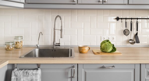 Деревянная столешница стала прекрасным экономичным решением: идеально вписалась не только в концепцию, но и в бюджет. Важно, что столешница именно деревянная, а не пластиковая с имитацией дерева. Чтобы вдоль рабочей зоны с мойкой и плитой было покрытие, прочное и легкое в уборке, здесь уложили керамогранит. В обеденной зоне – ламинат, как и в остальных помещениях квартиры. На фартуке использовали недорогую плитку, но выполнили нестандартную раскладку.