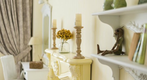 Светлые – белые, розовые, желтоватые, кремовые – свечи поместите в подсвечники, декорированные живыми цветами или красивыми сухоцветами. Для этого цветы разместите по окружности подсвечника и закрепите лентой.