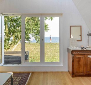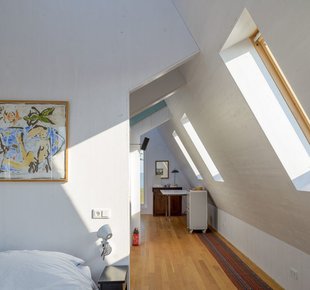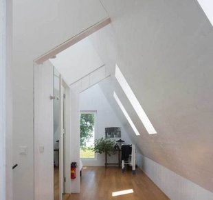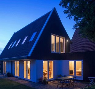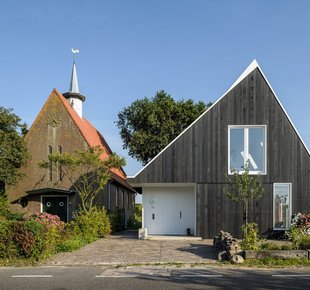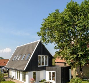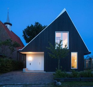 В Европе много маленьких городов, привлекающих туристов своим неповторимым колоритом. Их виды порой напоминают открытки — узкие улочки, старинные церкви, милые кофейни и аккуратные, иногда как будто игрушечные домики. Внешний облик новых построек в таких городках контролируется на государственном уровне - весь «новодел» должен иметь вид, соответствующий местным архитектурным традициям Аналогичные правила работают и в живописном голландском городке Уитдам, расположенном на берегу озера Эйсселмер. Здешний муниципалитет требует, чтобы любая новая застройка была адаптирована под исторический контекст. Поэтому супружеская пара, купившая небольшой участок с домом под снос, не имела возможности выбирать стиль и этажность своего нового жилища. Форма коттеджа, наружная отделка и даже уклон крыши были продиктованы соседними постройками. Дом, спроектированный Korteknie Stuhlmacher Architecten, настолько гармонично вписался в окружающее пространство, что кажется, он стоит здесь уже не один десяток лет. Темные фасады, натуральная черепица и высокая двускатная кровля «подружили» его с традиционной архитектурой района. За наружной сельской простотой скрывается современная комфортная жилая среда. Заказчики хотели светлый интерьер с высокими потолками. Как говорит хозяйка: «Нам важно ощущение простора». По местным законодательным требованиям водосток не должен быть выше 2,5 м, что ограничивало высоту первого этажа. Поэтому водосточную систему частично сделали скрытой (лишь в двух местах трубы оставлены в открытом положении). Значительный угол наклона крыши сделал потолки второго этажа высокими, а изобилие белого в отделке добавило всем комнатам объема и легкости. Белые оконные рамы и окантовка кровельных скатов породнили дом с сельской архитектурой Уитдама Задачей архитекторов было спроектировать коттедж, по-сельски скромный снаружи и просторный внутри. По словам хозяйки, проект подошел им «как перчатка» В качестве основного материала для отделки стен хозяева выбрали деревянные панели. Их покрыли полупрозрачным белым лаком Главные помещения (гостиная и кухня-столовая) находятся на первом этаже, спальни - на втором Чтобы один из скатов крыши не мешал росту раскидистого дерева, ему придали особую форму. Естественный свет второму этажу обеспечивают мансардные окна и ленточное остекление в кровельном коньке : спальни, гостиные, детские, прихожие и другое