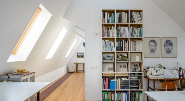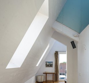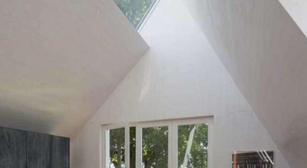 Заказчики хотели светлый интерьер с высокими потолками. Как говорит хозяйка: «Нам важно ощущение простора». По местным законодательным требованиям водосток не должен быть выше 2,5 м, что ограничивало высоту первого этажа. Поэтому водосточную систему частично сделали скрытой (лишь в двух местах трубы оставлены в открытом положении). Значительный угол наклона крыши сделал потолки второго этажа высокими, а изобилие белого в отделке добавило всем комнатам объема и легкости. Белые оконные рамы и окантовка кровельных скатов породнили дом с сельской архитектурой Уитдама