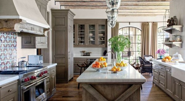 Потолок кухни в стиле прованс в частном доме часто оформляют с помощью балок, настоящих или декоративных. Необязательно придавать им идеальный вид. Пусть они производят впечатление обтесанных топором.