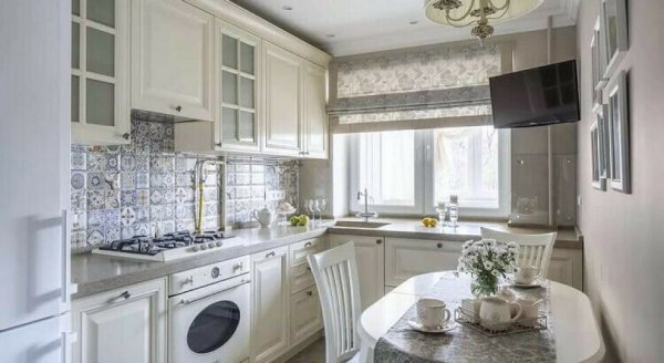 Белый — маленькая кухня в стиле прованс, выполненная в этом тоне, выглядит просторнее и светлее. А чтобы уйти от ощущения стерильности, в интерьер добавляют цветовые акценты: вазочки, декоративные тарелки, баночки для специй, сушеные травы. Белый с синим — беспроигрышный вариант оформления.
