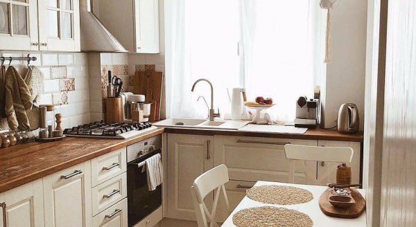 Главное в гарнитуре — лаконичность и простота. Белый, бежевый, пепельный серый или голубой — самые популярные цвета. Столешница может быть выполнена из искусственного или натурального камня, дерева, а фартук — из плитки.Максимум естественного света достигается за счет легких штор, а иногда можно обойтись и вообще без них.