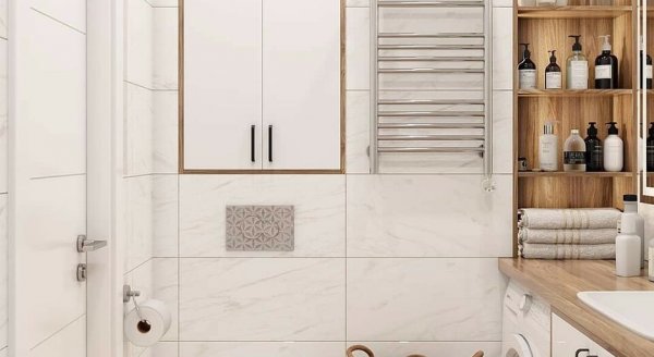 Поддержать общую скандинавскую стилистику в ванной можно при помощи светлой плитки. Чтобы не было скучно, сочетайте разные фактуры на полу и на стенах. Мебель может быть деревянной.