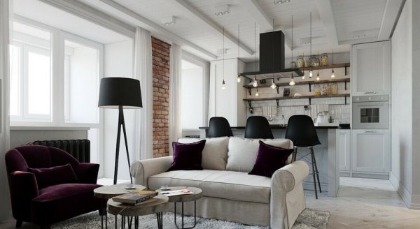 Поскольку в таких квартирах нет перегородок, очень важным становится зонирование пространства. Сделать это можно визуально с помощью сочетания фактур, например, отделки пола, или за счет различных перегородок и занавесей.