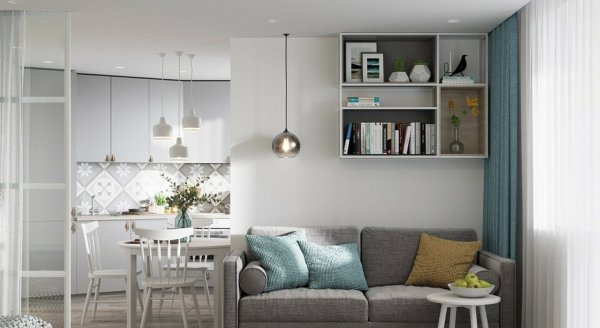 В малогабаритных пространствах пользуются также цветовым выделением: к примеру, рабочую зону кухни и обеденную группу полностью сделать в белом цвете. А зону отдыха — цветным акцентом.