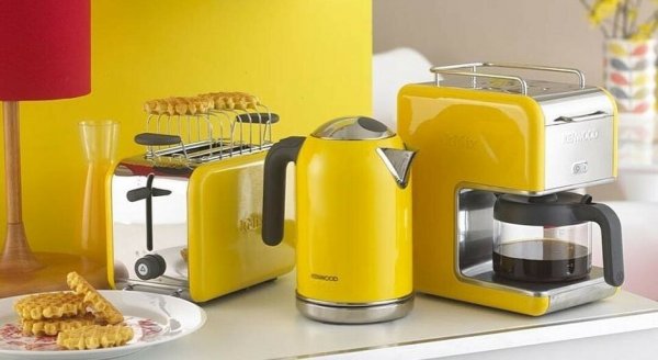 Активный желтый цвет улучшает аппетит, так что его часто используют именно для оформления кухни и столовой. Оптимально, если доля этого оттенка будет не более 20-30 процентов. Солнечный оттенок хорошо смотрится на маленькой кухне. Особенно хороши светлые оттенки, например, канареечный или лимонный. Если хочется чего-то особенного, но яркие фасады смущают, можно добавить акцент помещению, поставив желтый холодильник.