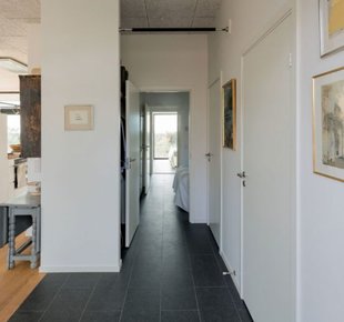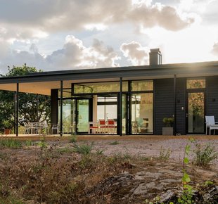 Загородные дома со стеклянными стенами популярны в странах Западной Европы — многие европейцы хотят постоянно ощущать единение с окружающим миром. По их мнению, ни к чему намеренно возводить преграды между собой и природой, частью которой мы являемся Компания Wahlin Arkitekter спроектировала этот загородный дом по заказу семейной пары. Супруги купили участок на территории южного шведского курорта Тореков (Torekov) и изначально хотели построить традиционный двухэтажный коттедж с большой террасой-палубой и зеленой крышей. Так они представляли себе место, где будет комфортно отдыхать не только летом, но и зимой. Однако, рассмотрев различные варианты, предложенные архитекторами, заказчики скорректировали свои планы. Из всего предложенного они одобрили проект одноэтажного здания в модернистском стиле в духе середины прошлого века. Спустя два года работ на живописном склоне появился дом площадью 100 м. Прозрачная постройка элегантно вписалась в окружающий пейзаж, расположившись прямо на холме в окружении деревьев, недалеко от морского пролива Каттегатт. Планировка вполне логична: внутреннее пространство поделено на открытую общественную зону и изолированную частную. В репрезентативной части находятся кухня, гостиная и столовая, а в частной - спальни и ванная комната. Несмотря на то, что общие помещения объединены, гостиная условно выделена за счет перепада высот пола. С трех сторон дома под выступающими кровельными свесами, поддерживаемыми прочными стойками, оборудована двухуровневая терраса. Архитекторы намеренно использовали природные цвета и простые материалы, чтобы создать дом, который не будет спорить с первозданной красотой природы. Большие стеклянные двери ведут из гостиной на просторную террасу. Общественную и частную зоны разграничивает небольшой коридор. Две спальни и ванная комната спланированы в задней части дома. Приватность этих помещений обеспечивает деревянный фасад с маленькими окошками. : спальни, гостиные, детские, прихожие и другое