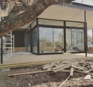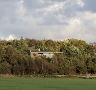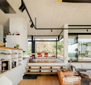 Прозрачная постройка элегантно вписалась в окружающий пейзаж, расположившись прямо на холме в окружении деревьев, недалеко от морского пролива Каттегатт. Планировка вполне логична: внутреннее пространство поделено на открытую общественную зону и изолированную частную. В репрезентативной части находятся кухня, гостиная и столовая, а в частной - спальни и ванная комната. Несмотря на то, что общие помещения объединены, гостиная условно выделена за счет перепада высот пола. С трех сторон дома под выступающими кровельными свесами, поддерживаемыми прочными стойками, оборудована двухуровневая терраса. Архитекторы намеренно использовали природные цвета и простые материалы, чтобы создать дом, который не будет спорить с первозданной красотой природы.