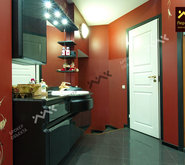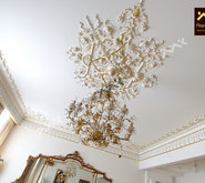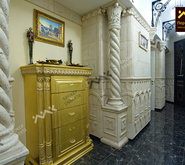 Квартиру украшают витые колонны, пилястры, позолоченная лепнина, шелк, мрамор, паркет из дерева ценных пород.
