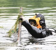 Работы проводятся сотрудниками «Мосводосток». В чистке пруда обычно участвует команда из четырех человек: руководитель водолазных спусков, страхующий (сидит на берегу в гидрокостюме наготове) и обеспечивающий (на сигнальном конце) водолазы и речной рабочий, который сидит в лодке. Со дна извлекают самый разный мусор. В этот раз вот попалась даже информационная табличка вместе со столбом.
