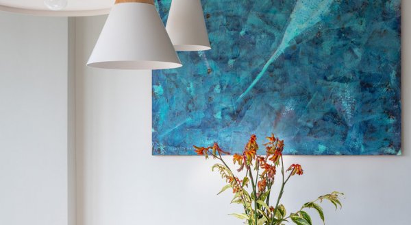 Цветовая палитра — пожелание заказчиков, им хотелось создать атмосферу летнего дня. Голубые, желтые, розовые оттенки разбавили зелеными комнатными растениями и яркими красными акцентами.