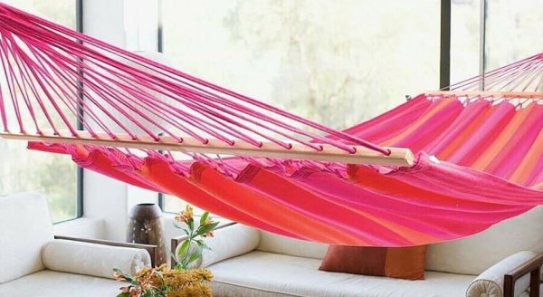 Гамак — аксессуар, который точно не останется незамеченным в вашем интерьере: он станет яркой деталью, изюминкой, эффектным декоративным акцентом. А еще этот элемент обстановки поможет внести иронию, снять излишнюю выверенность интерьера, добавить цветов и фактур (особенно если дополнить декоративными подушками и пледом).