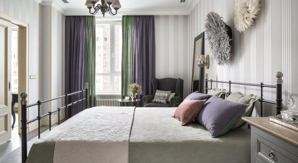 Мебель и декор в интерьере разной ценовой категории, есть много предметов из ИКЕА. В выборе Олеся Шляхтина ориентировалась на внешний вид и сочетаемость предметов между собой. В спальне намеренно использовали эффект асимметрии: с одной стороны кровати с металлической графичной спинкой поставили легкий столик-консоль со стеклянной столешницей, с другой — деревянный комод с выдвижными ящиками. По соседству — обитое темной тканью кресло с ушами и декоративными гвоздиками, над изголовьем — необычные панно из перьев.