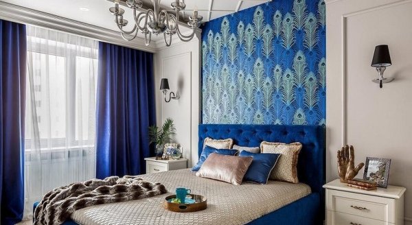Отличное решение в небольшой спальне — заполнить акцентную стену у изголовья кровати геометрическим принтом. Это преобразит комнату и визуально расширит пространство. Плюс метода в том, что стена находится у изголовья, и она не будет рябить в глазах и обращать на себя внимание при пробуждении.